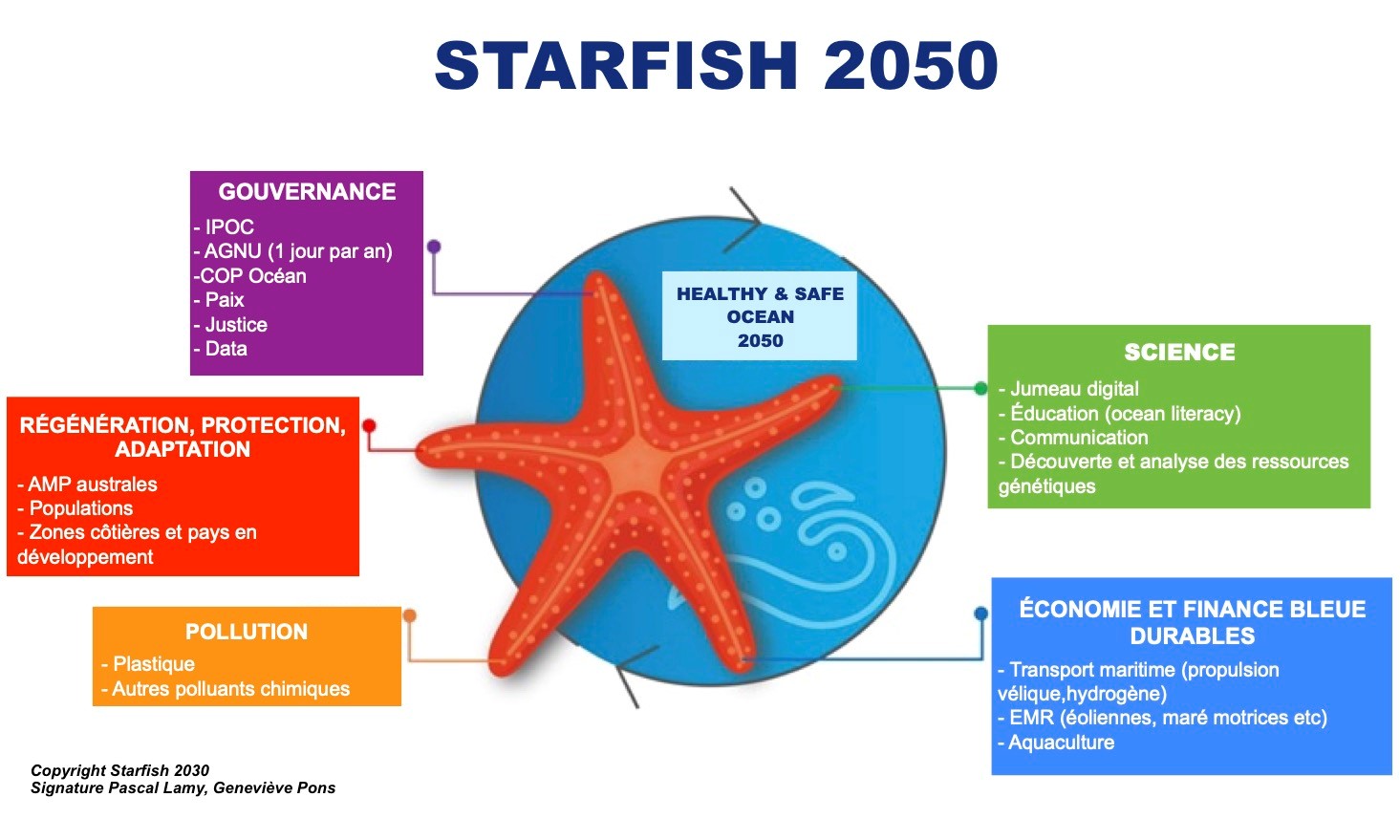The new Mission uses the symbol of the starfish with its five branches, based on the five major themes carried out by the EU within the Starfish Mission: Governance; Regeneration, Protection, Adaptation; Pollution; Sustainable Blue Economy & Finance; Science.