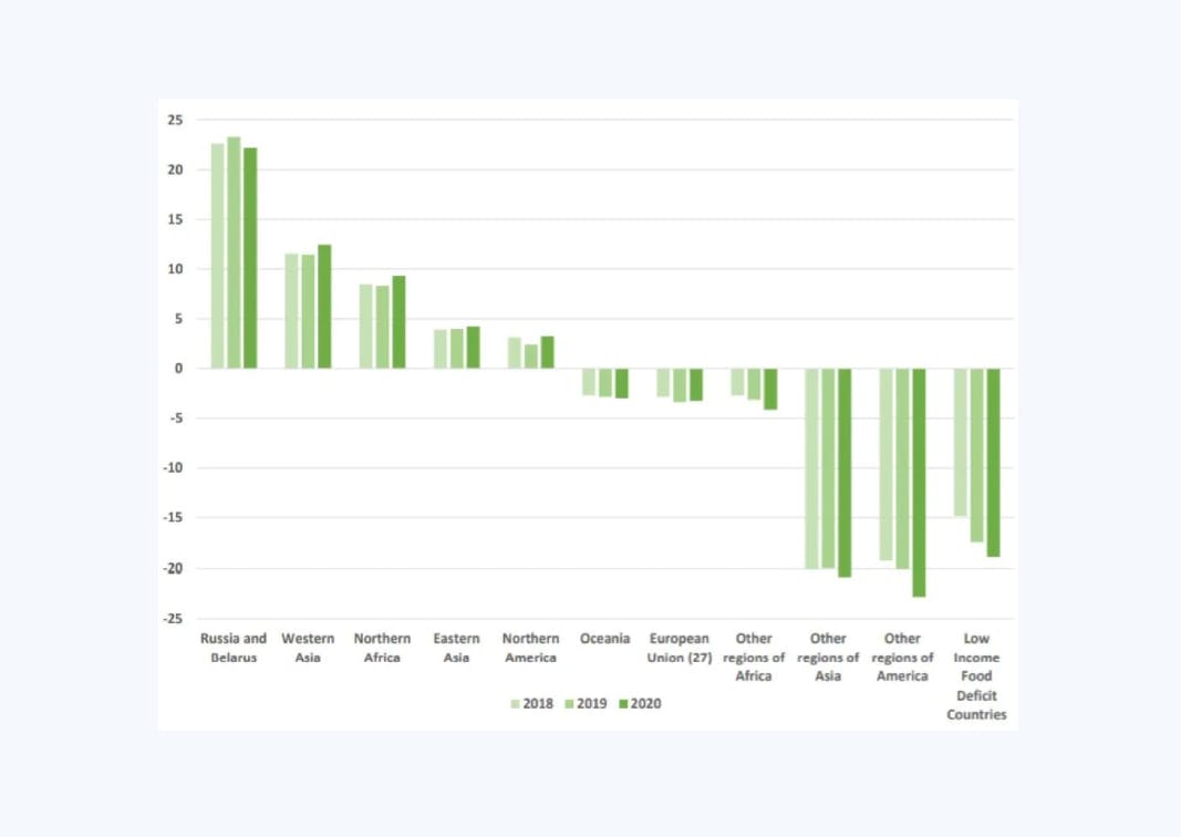 FAOSTAT Net trade of fertilisers expressed in million tonnes of nutrients (2022)